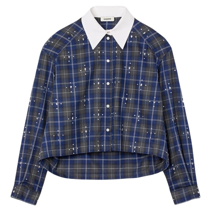 季末6折SANDRO2025秋冬新款女装法式棉质仿钻格纹翻领上衣衬衫