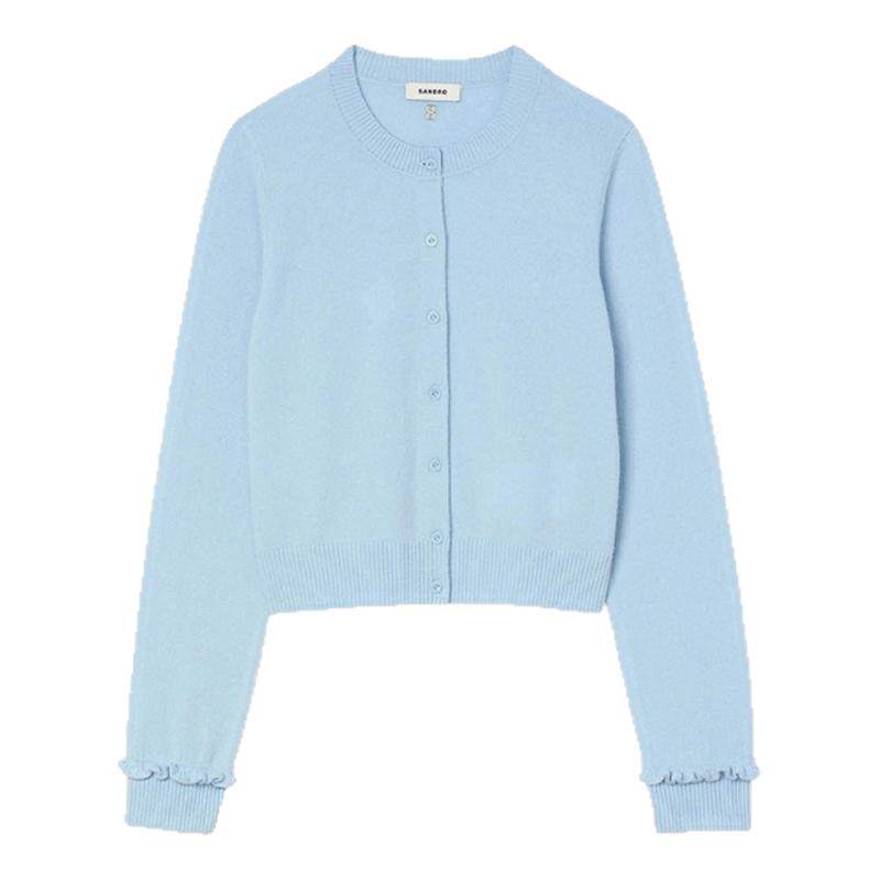 季末7折SANDRO2025秋冬新款女装气质天蓝色木耳边袖口针织开衫