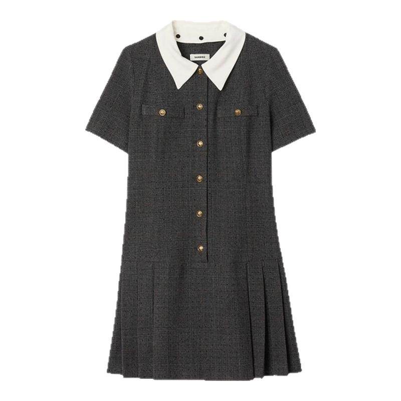 季末7折SANDRO秋冬女装法式黑色多口袋亮色扣无袖短款花呢连衣裙