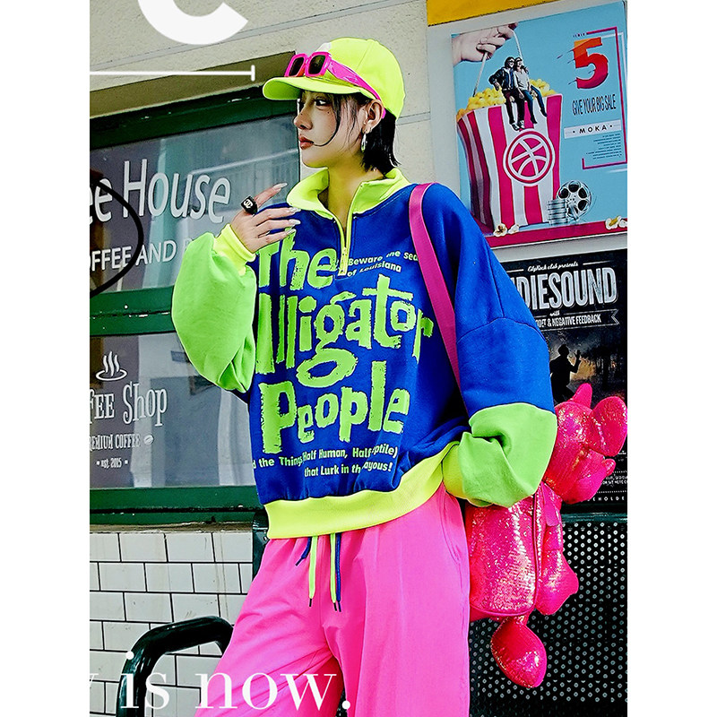 YHAY宝蓝彩色字母加绒加厚休闲卫衣秋冬新款撞色拼接潮牌宽松外套