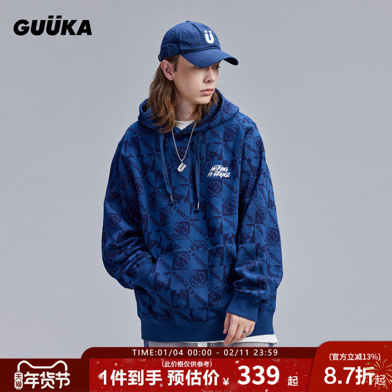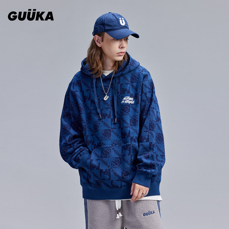 GUUKA哪吒闹海联名宝蓝色连帽卫衣男抓绒加厚冬季满印帽衫宽松