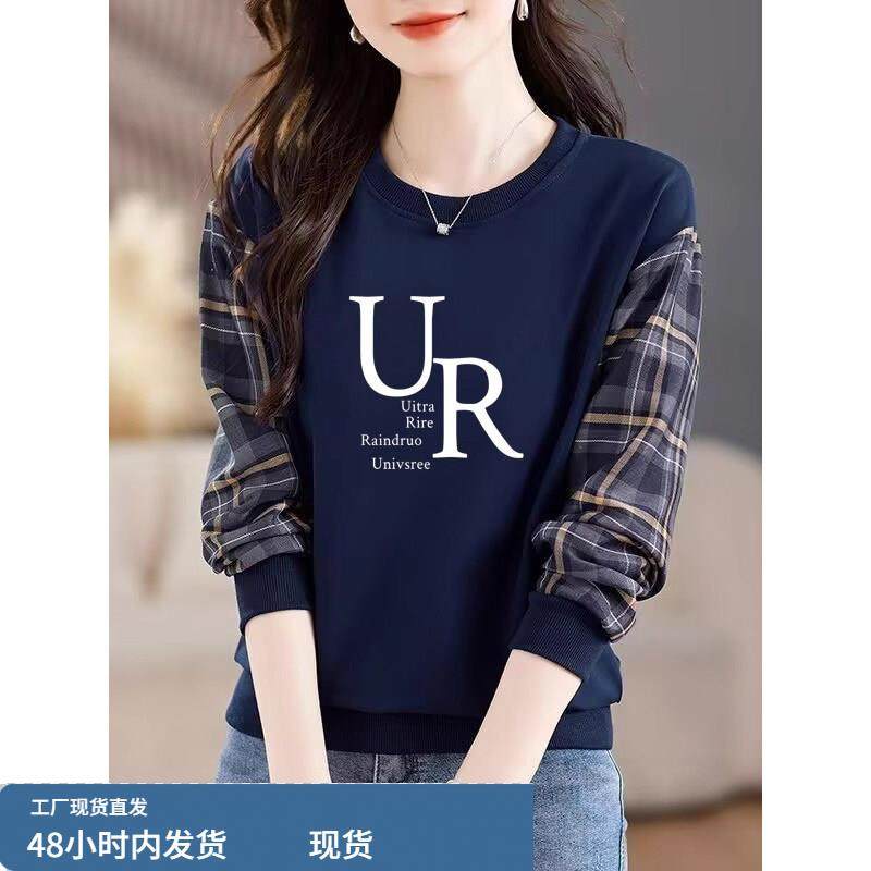 宝蓝色拼接格子圆领长袖卫衣女秋冬季欧货内搭印花打底衫减龄上衣