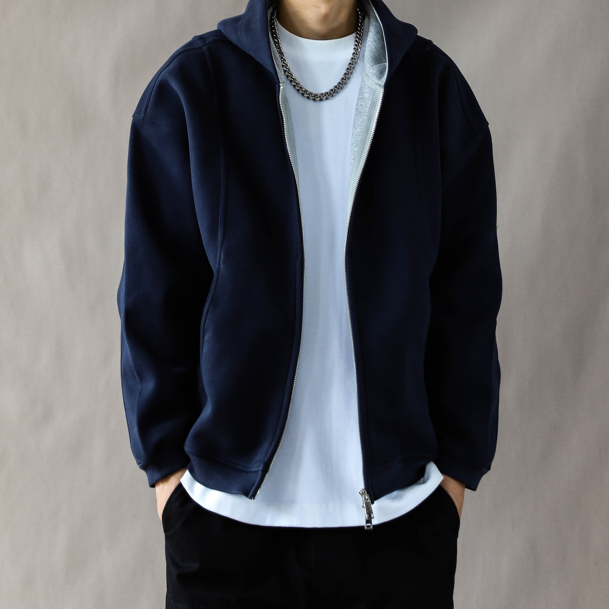 美式复古重磅夹克男春秋宽松休闲2025新款连帽卫衣开衫外套宝蓝色