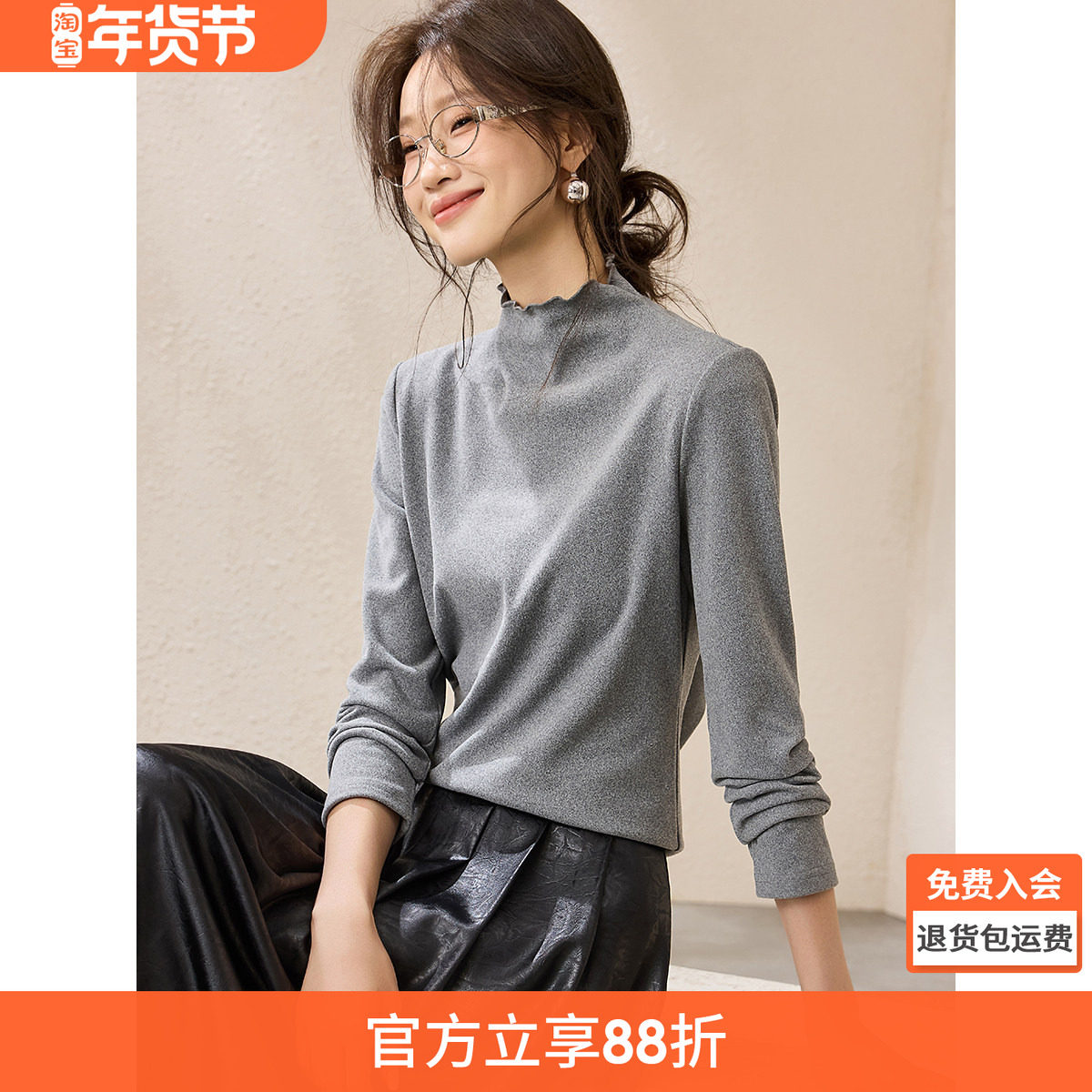 木耳边打底上衣正肩西装内搭半高领长袖T恤女修身显瘦莫代尔螺纹