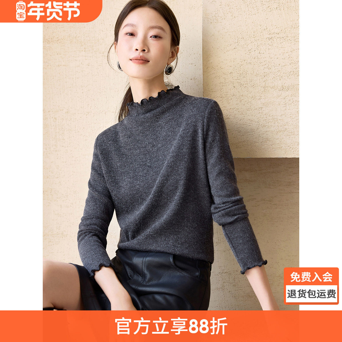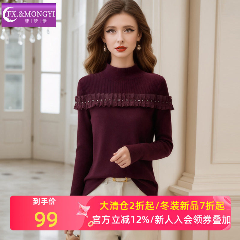 菲梦伊多颜色含羊毛烫钻木耳边打底针织衫女冬季设计感半高领毛衣