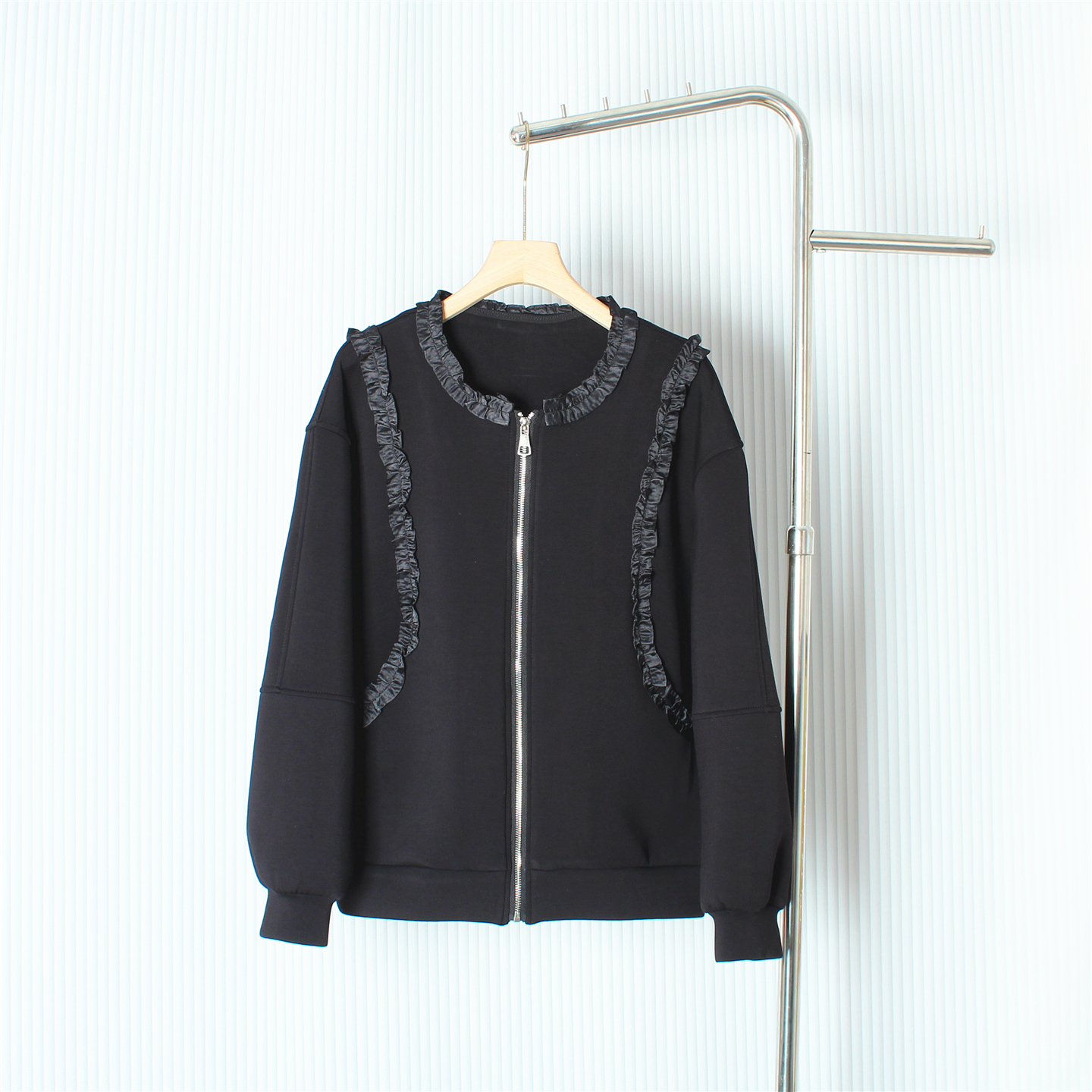 欧洲站时尚木耳边棒球服拉链开衫女宽松大码长袖太空棉黑色短外套