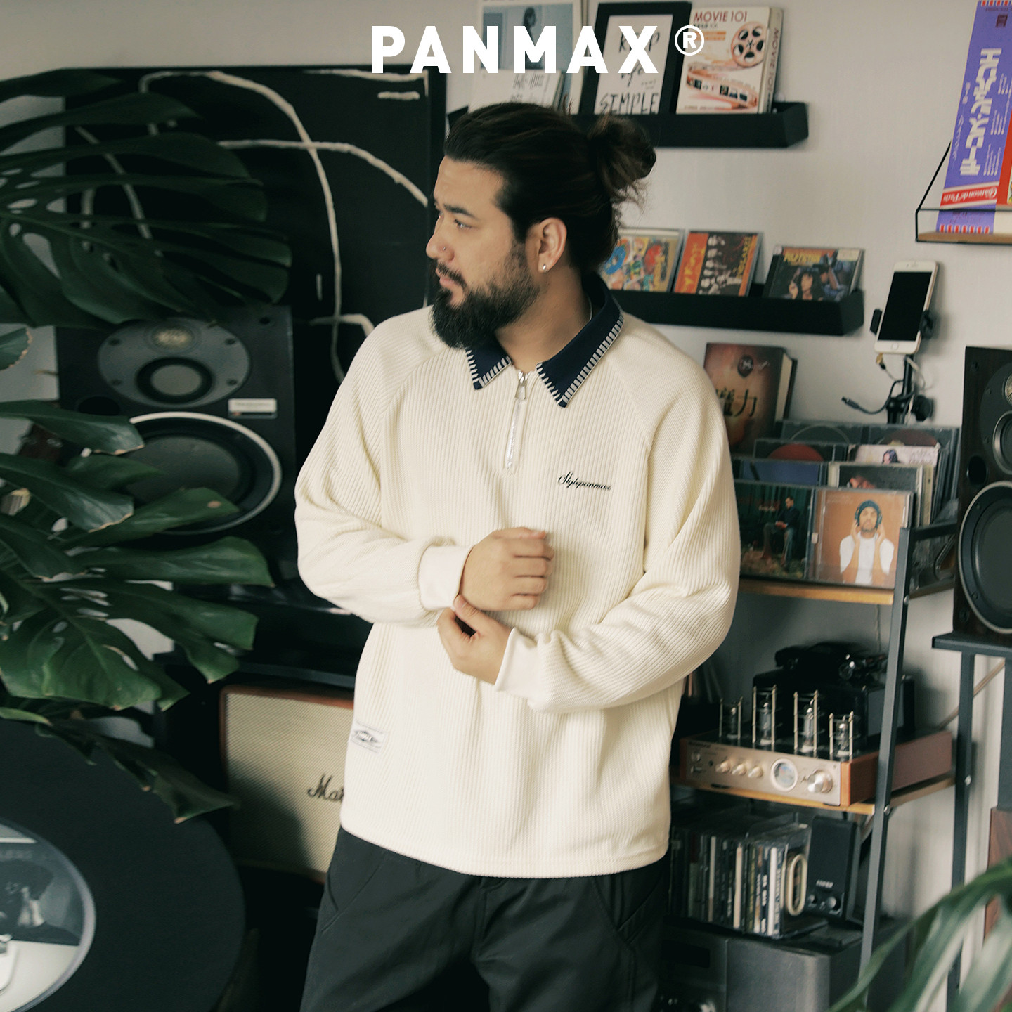 PANMAX潮牌大码男装半拉链卫衣运动POLO领长袖竖条纹宽松百搭上衣