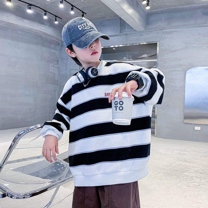 男大童春秋款黑白条纹宽松卫衣2024新款儿童男孩秋装酷帅薄上衣潮