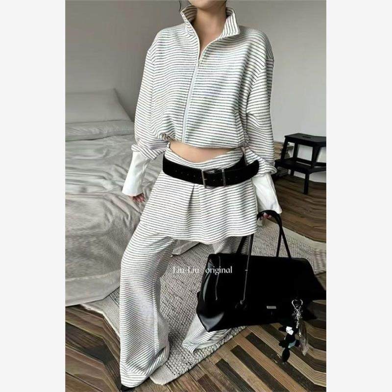 2025秋冬新款韩版复古条纹宽松卫衣外套屁帘休闲长裤两件套装女潮