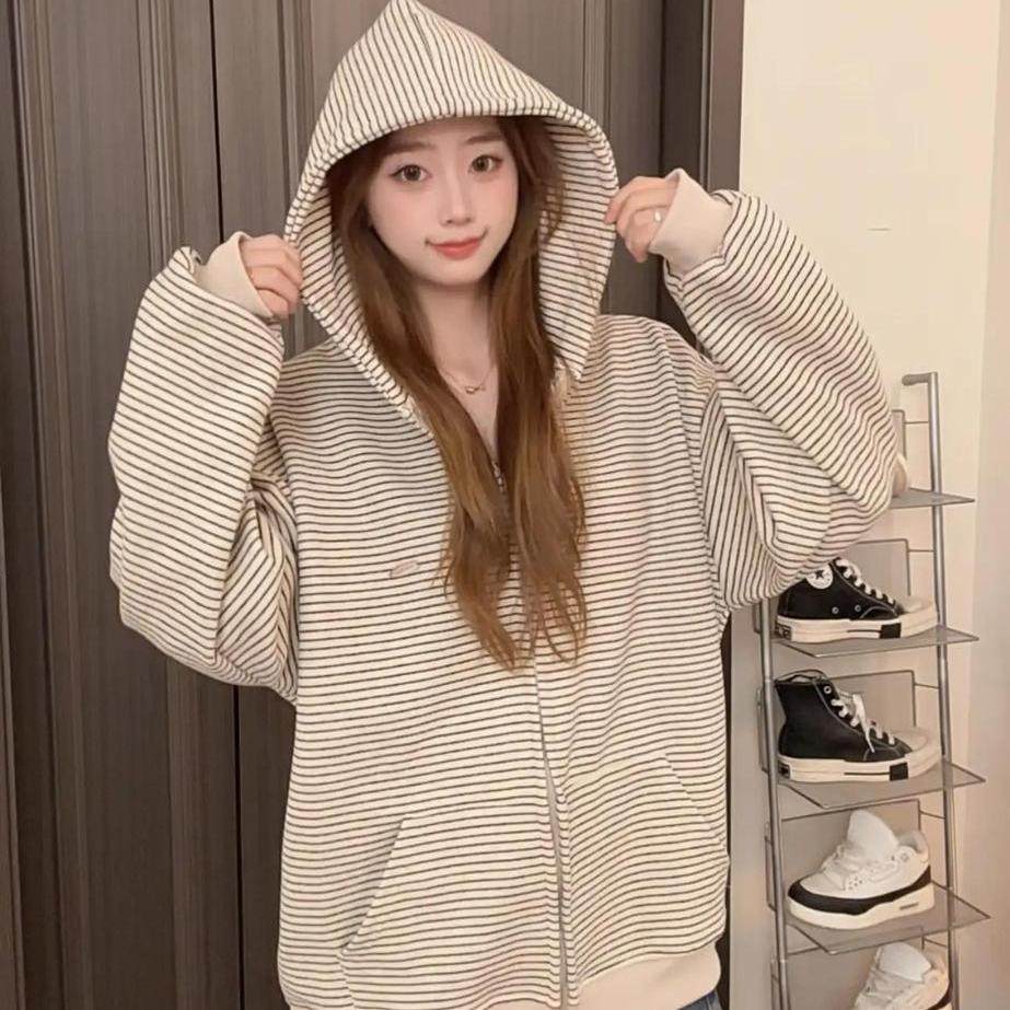 美式复古条纹连帽卫衣女秋冬新款加绒宽松慵懒风初高中生长袖外套