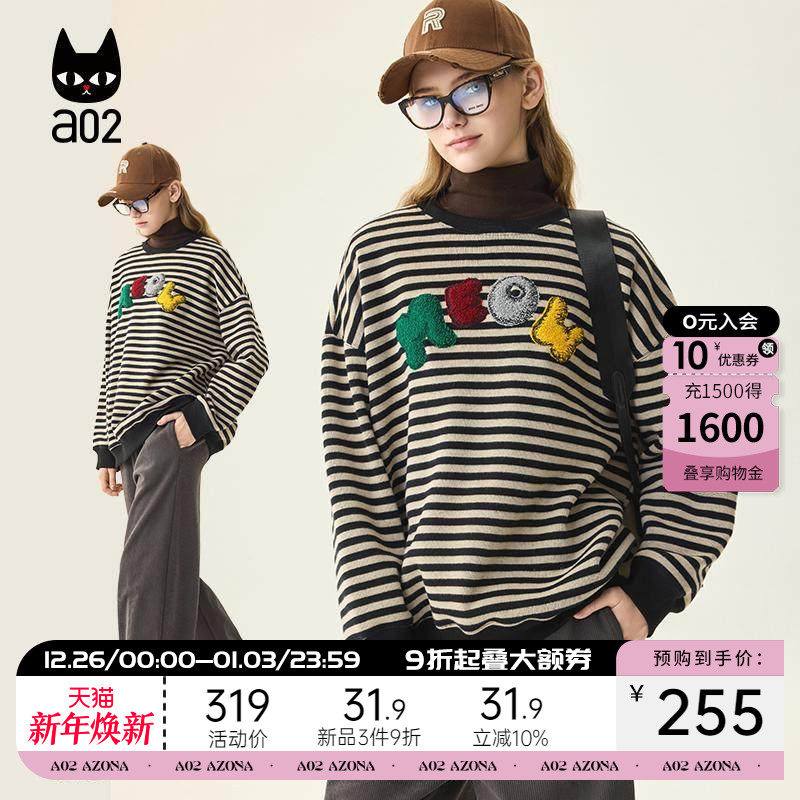 a02条纹加绒卫衣女秋冬百搭2025新款时尚洋气宽松显瘦圆领上衣