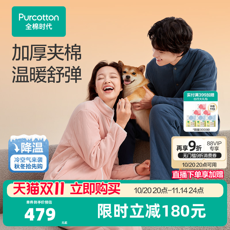 全棉时代睡衣女士针织夹棉加厚保暖家居服加绒居家女生可外穿秋冬