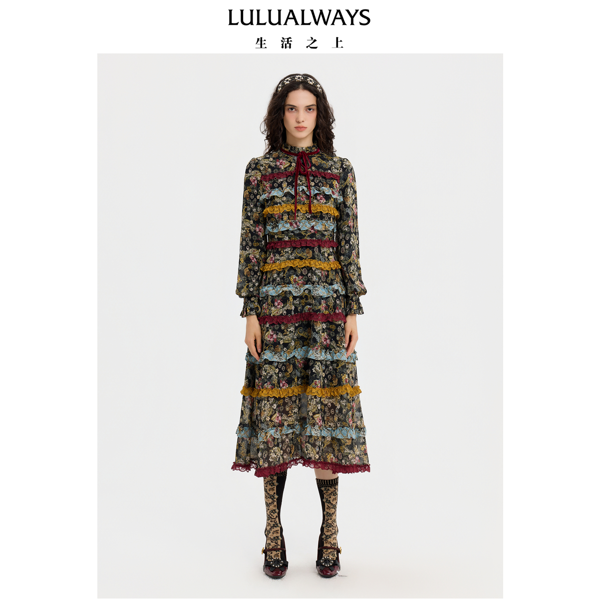 LULUALWAYS【商场同款】25冬季新款复古华丽雪纺蛋糕裙长款连衣裙