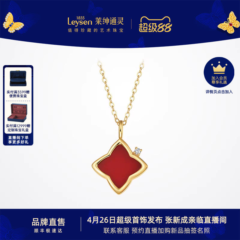 莱绅通灵18K金钻石吊坠银项链女 HER红玛瑙颈饰挂坠四叶草四芒星