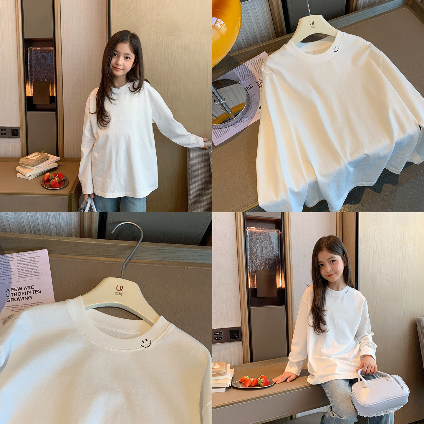 - 竹节棉白色长袖t恤 女
