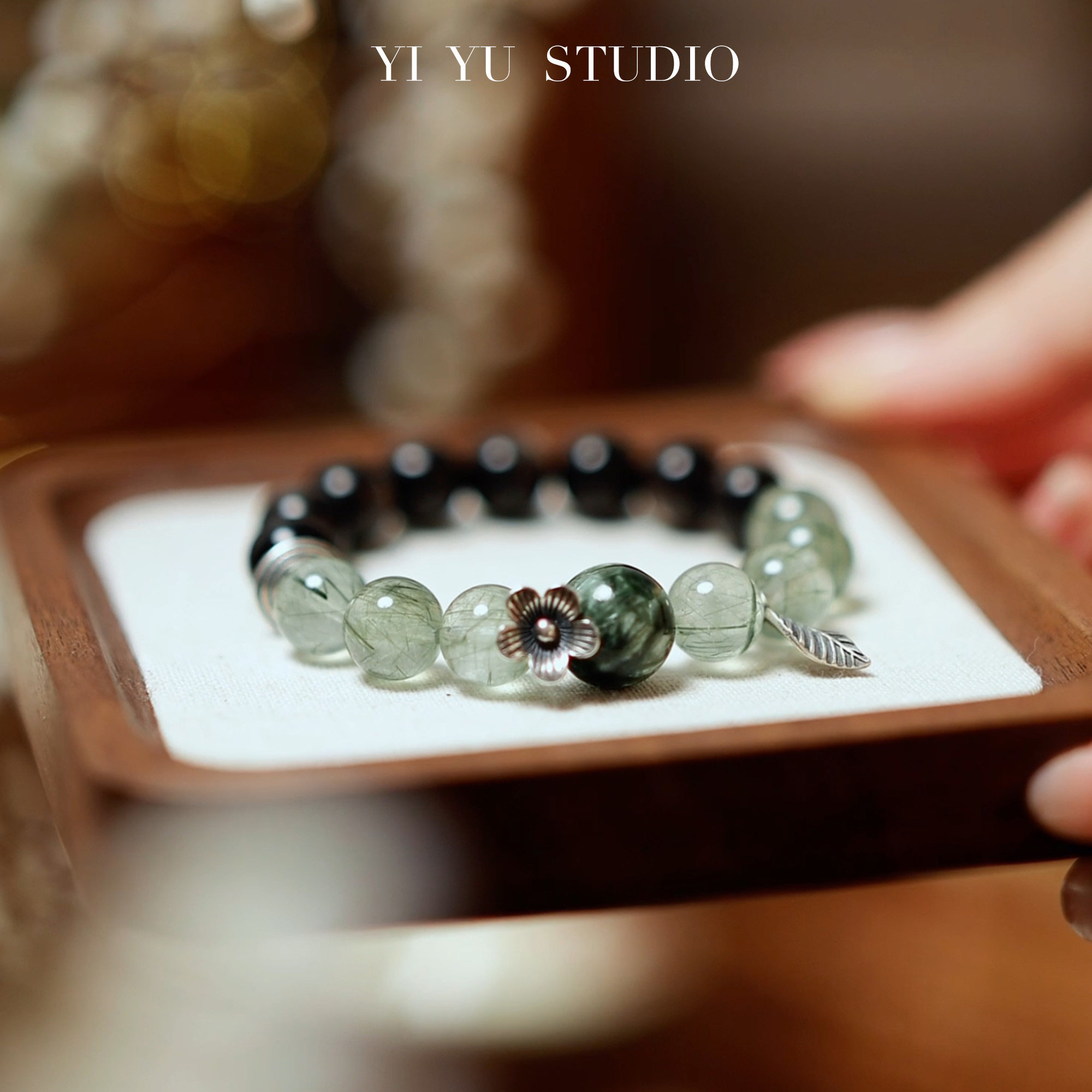 天然水晶手串绿龙晶黑曜石绿发晶S925银女文艺原创森系民族风手链