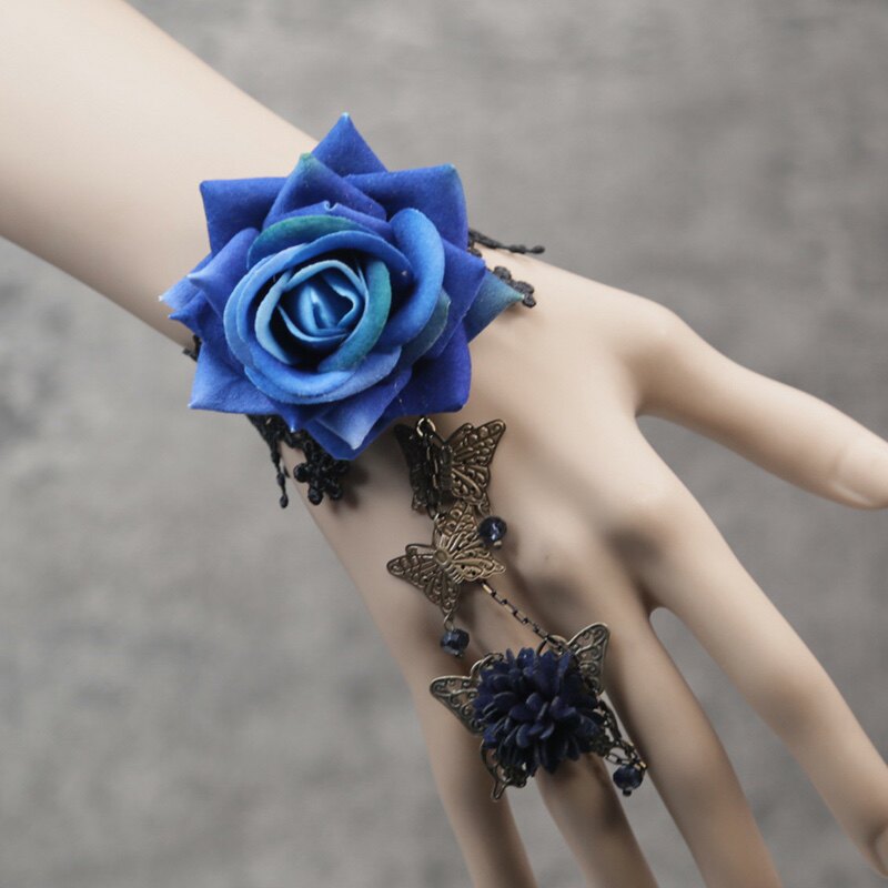 原创设计DIY森系洛丽塔蕾丝植绒玫瑰花朵蝴蝶水晶舞台表演手链