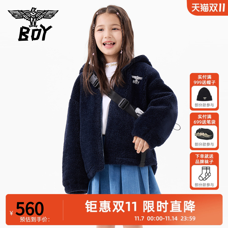 BOY 童装潮牌秋冬加厚短款连帽外套仿羊羔绒loog老花外套