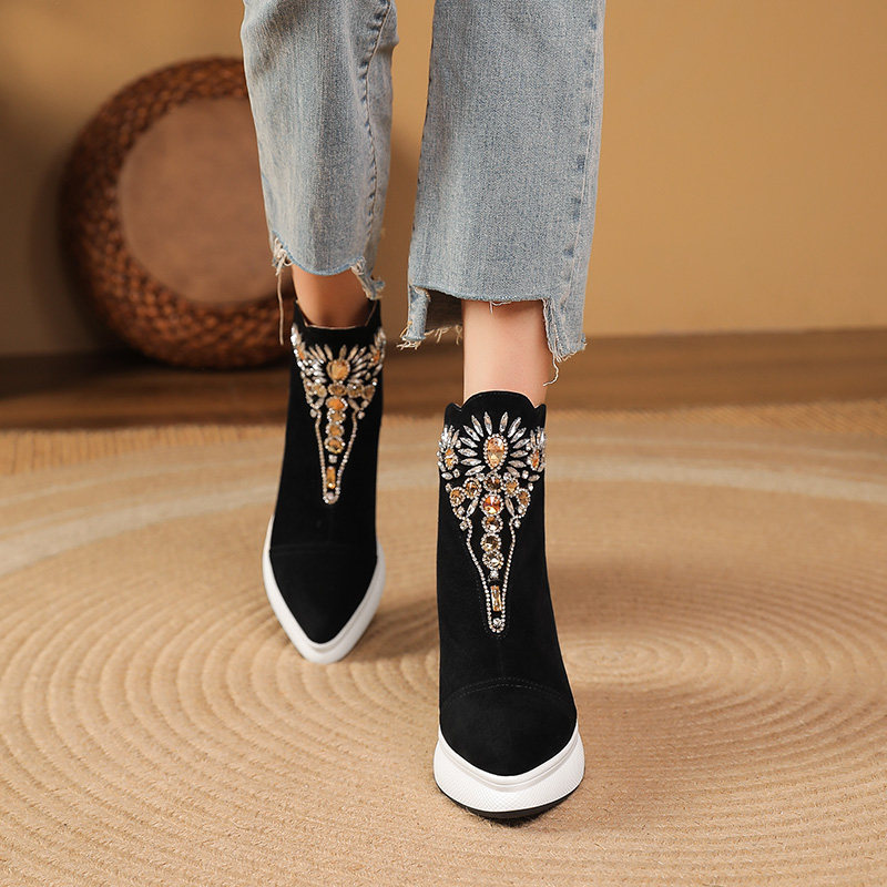 厚底短靴女2024秋冬真皮松糕尖头小个子内增高后拉链水钻坡跟女靴