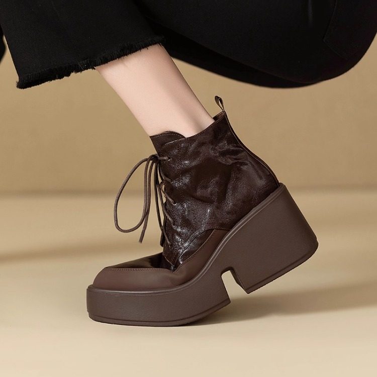 法式覆古厚底增高坡跟单鞋女秋冬尖头粗跟系带深口小皮鞋软松糕鞋