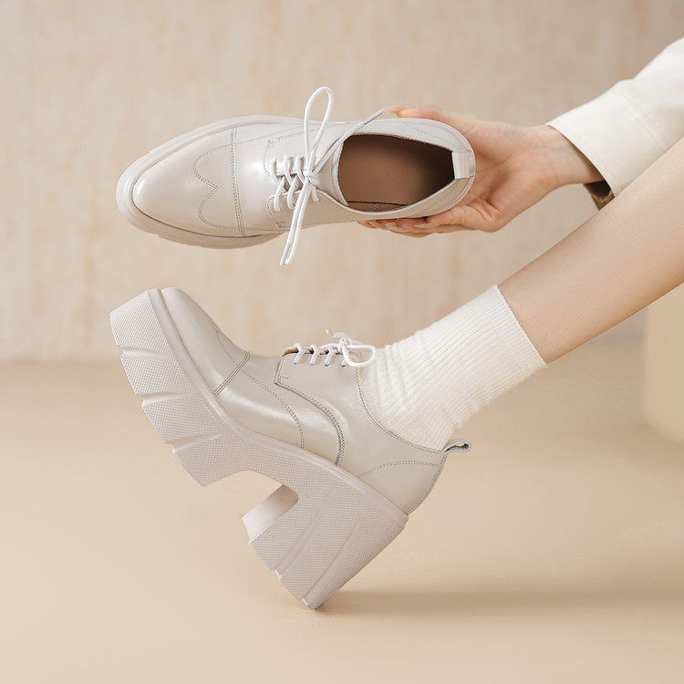 真皮版~欧洲站系带尖头厚底松糕布洛克JK小皮鞋英伦风小个子女鞋