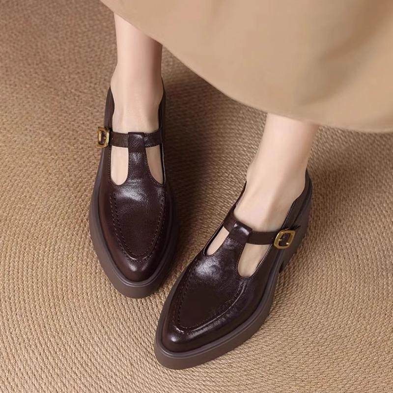 尖头厚底单鞋女2025年新款浅口一字扣玛丽珍鞋粗跟真皮百搭松糕鞋