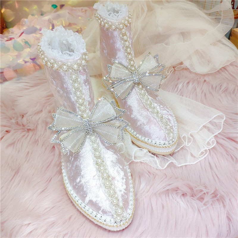 日系淡粉尖头内增高中跟洛丽塔短筒马丁靴女鞋2025秋冬款松糕蝴蝶