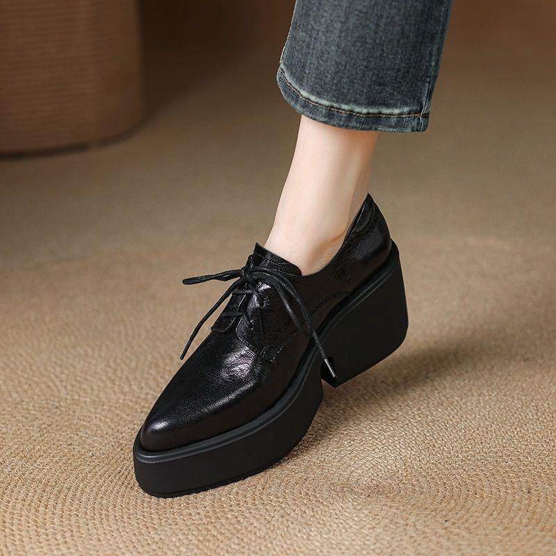 真皮松糕鞋女厚底2025新款春秋百搭英伦风系带小皮鞋尖头小黑鞋单