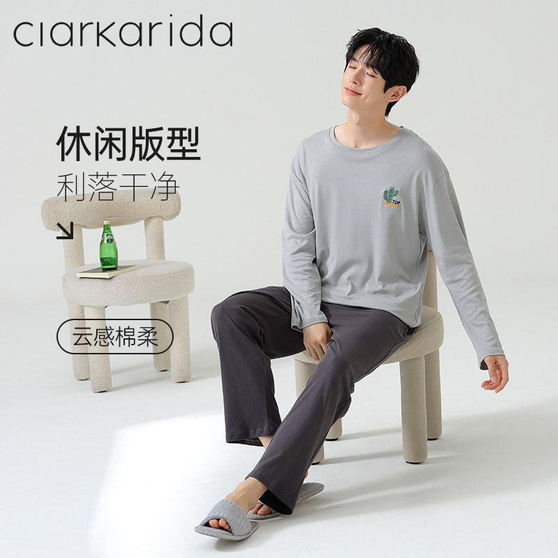 clarkarida男士睡衣长袖纯棉套头秋季套装休闲条纹全棉柔软家居服