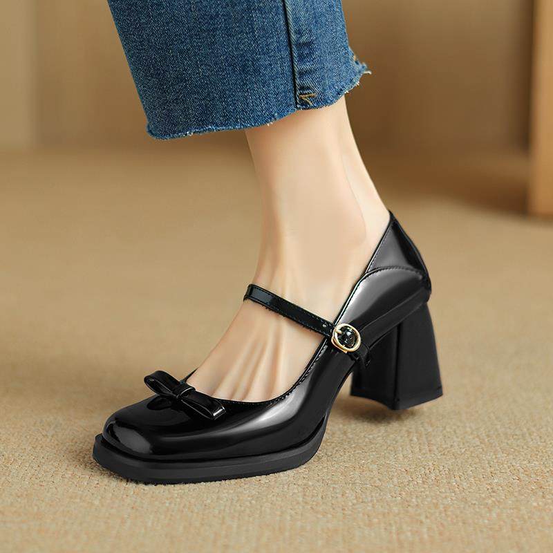 女软漆皮气质珍鞋高玛丽跟蝴蝶结皮厚跟复古春秋底单鞋圆头法式粗