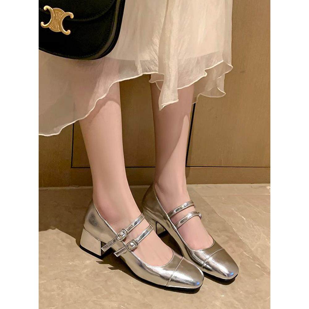 香港银色厚跟玛丽珍女鞋2025春秋季新款法式浅口中跟一字扣鞋