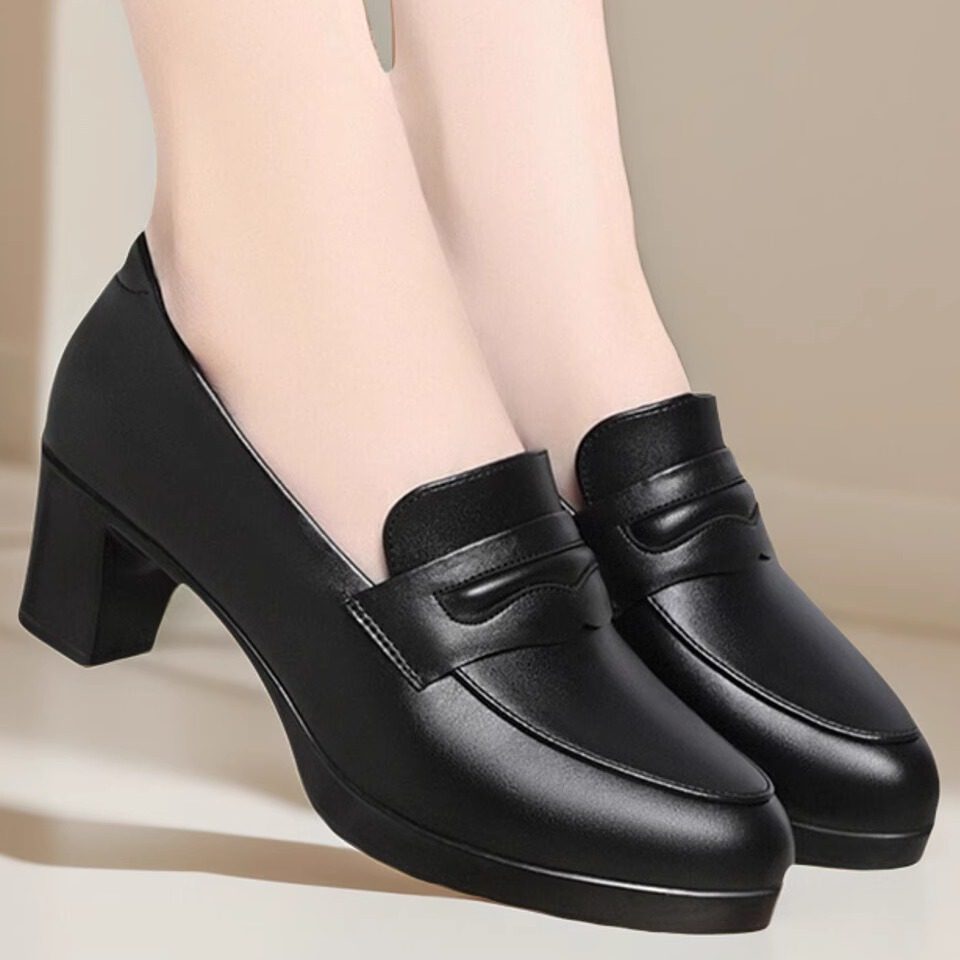 乐福鞋厚跟2025年新款软皮单鞋真皮小个子增高中年女士工作皮鞋女