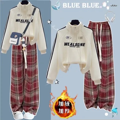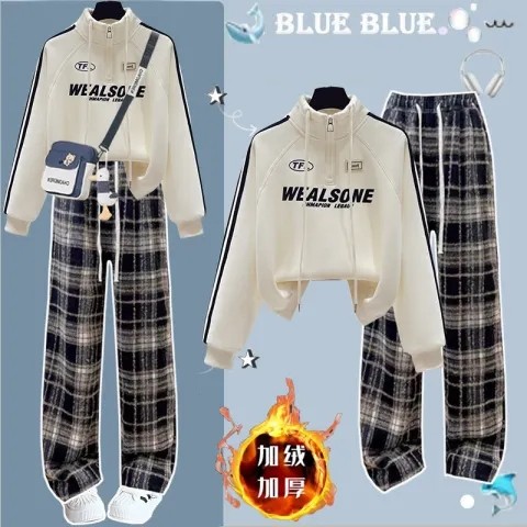 大童高中生学院风半拉链加绒卫衣女2025秋冬新款初中学生时尚套装