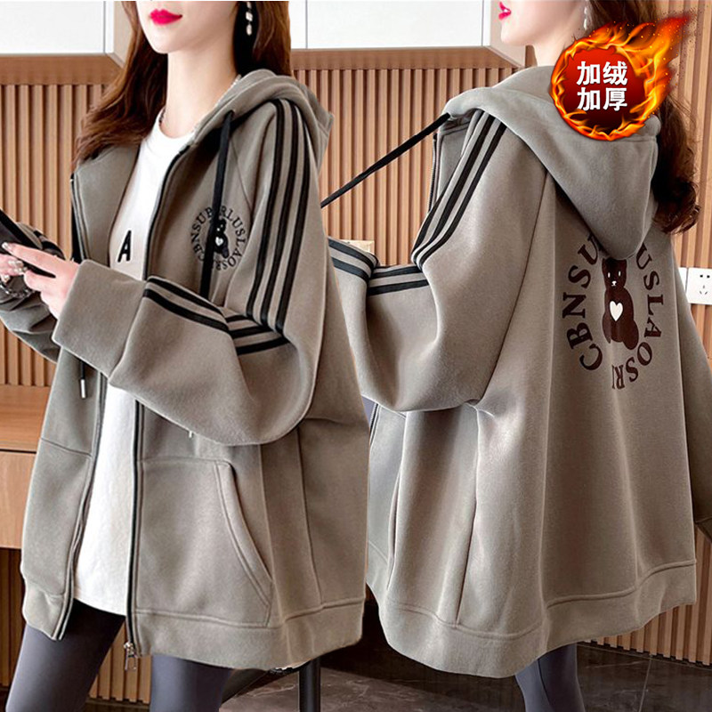 大码女装卡通拉链加绒卫衣女秋冬新款韩版宽松百搭bf慵懒风外套潮