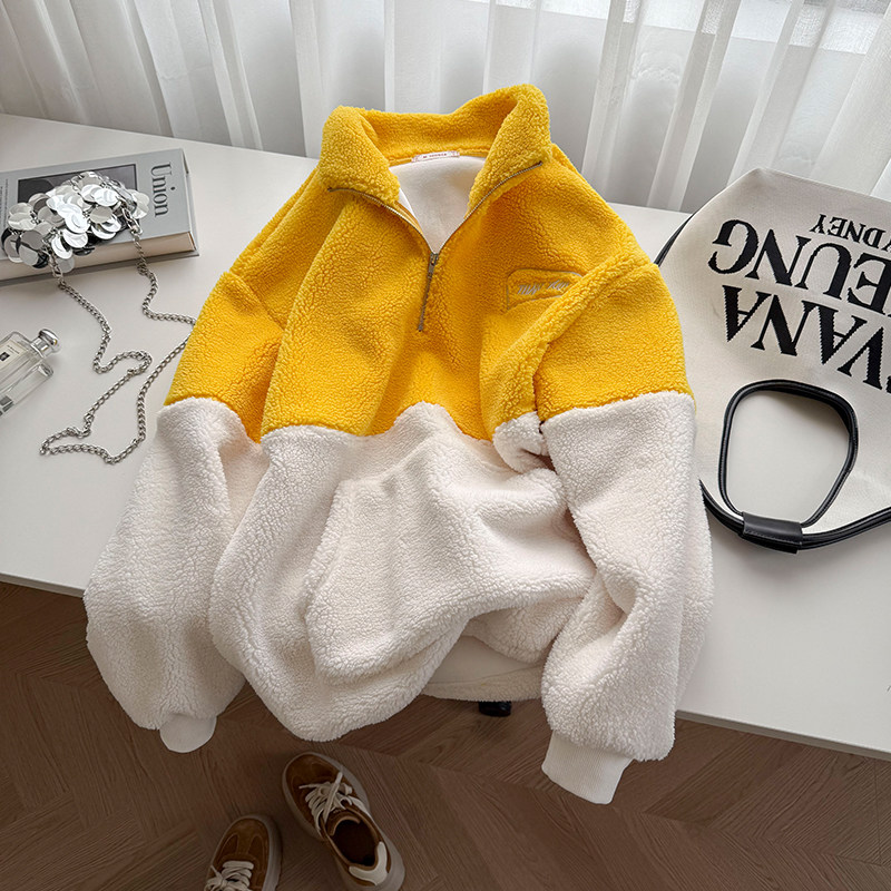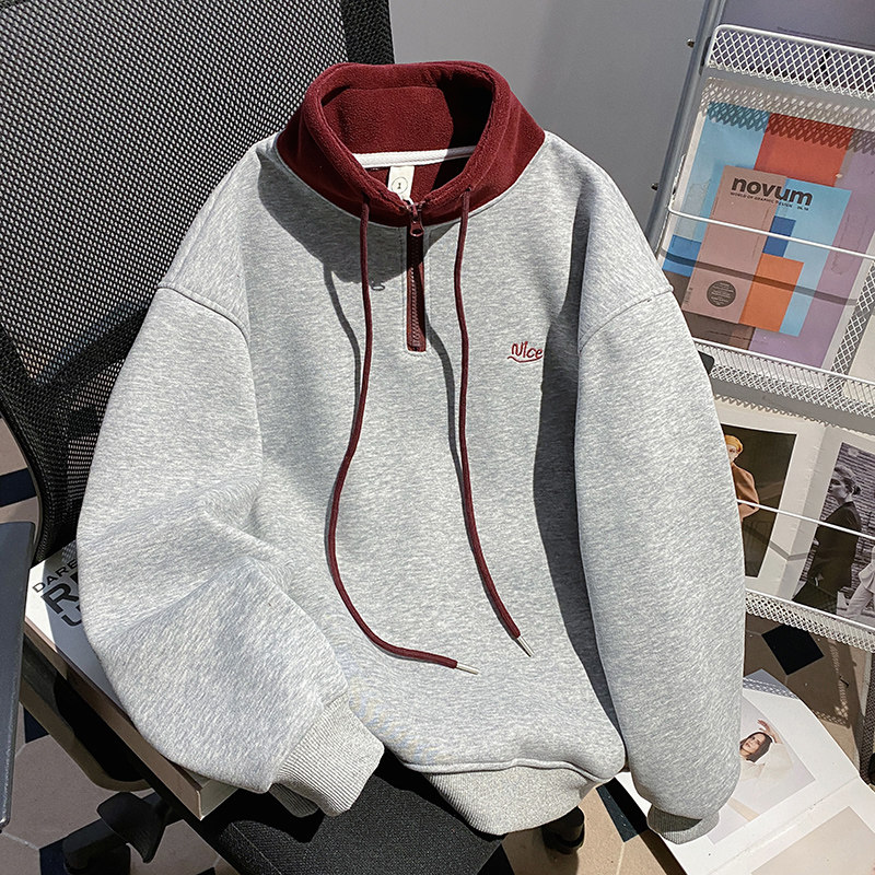 胖妹妹大码美式设计感撞色立领半拉链加绒卫衣女秋冬宽松保暖上衣