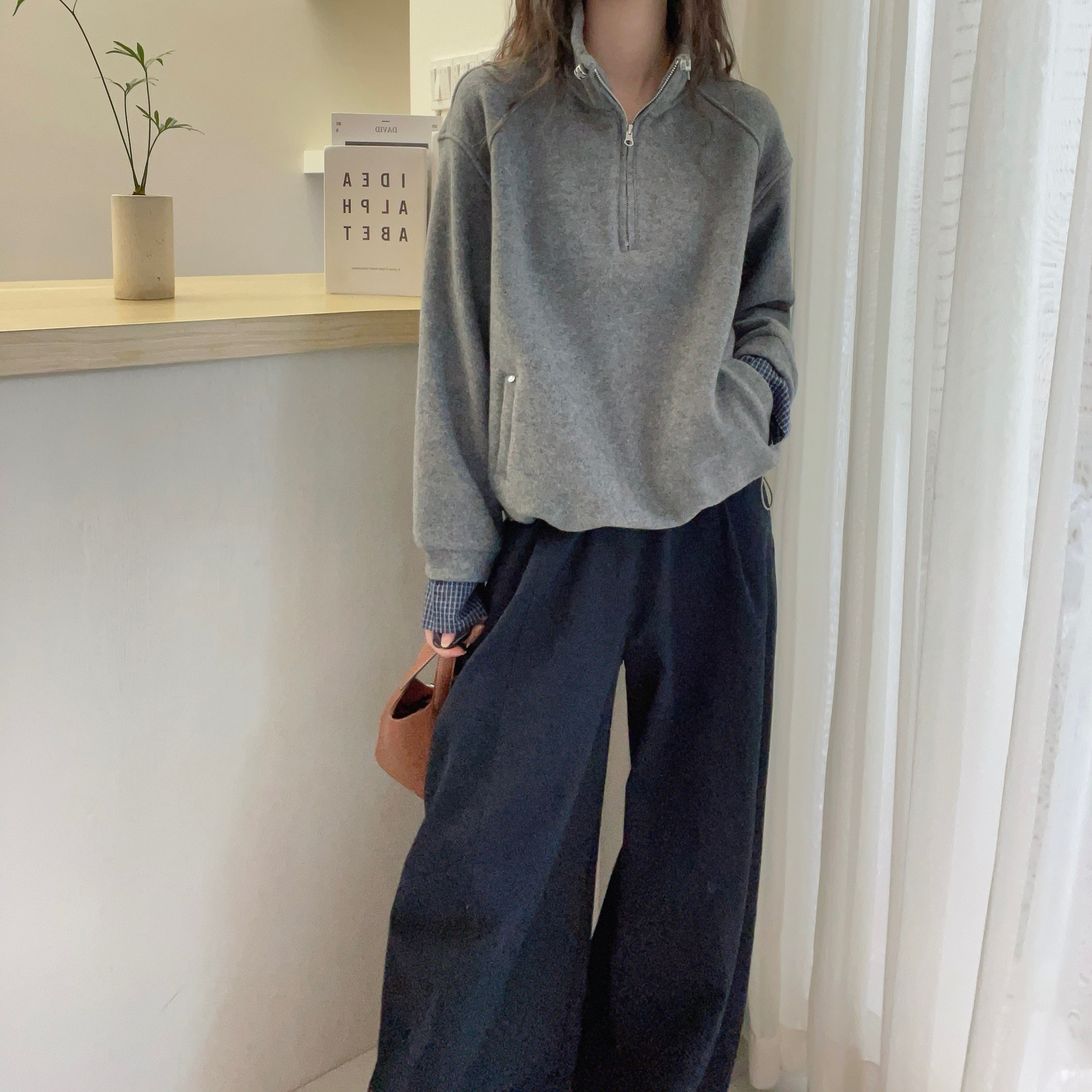 廓形立领半拉链加绒卫衣女冬季设计感拼接宽松休闲纯色上衣外套潮
