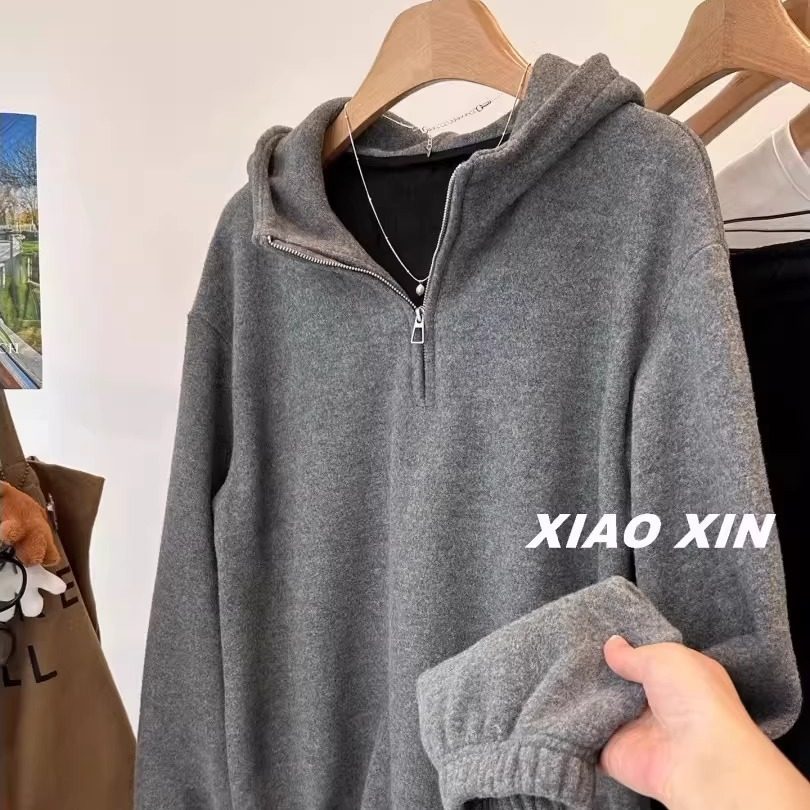 大码300斤时尚洋气半拉链加绒卫衣女秋冬慵懒风保暖连帽上衣外套2