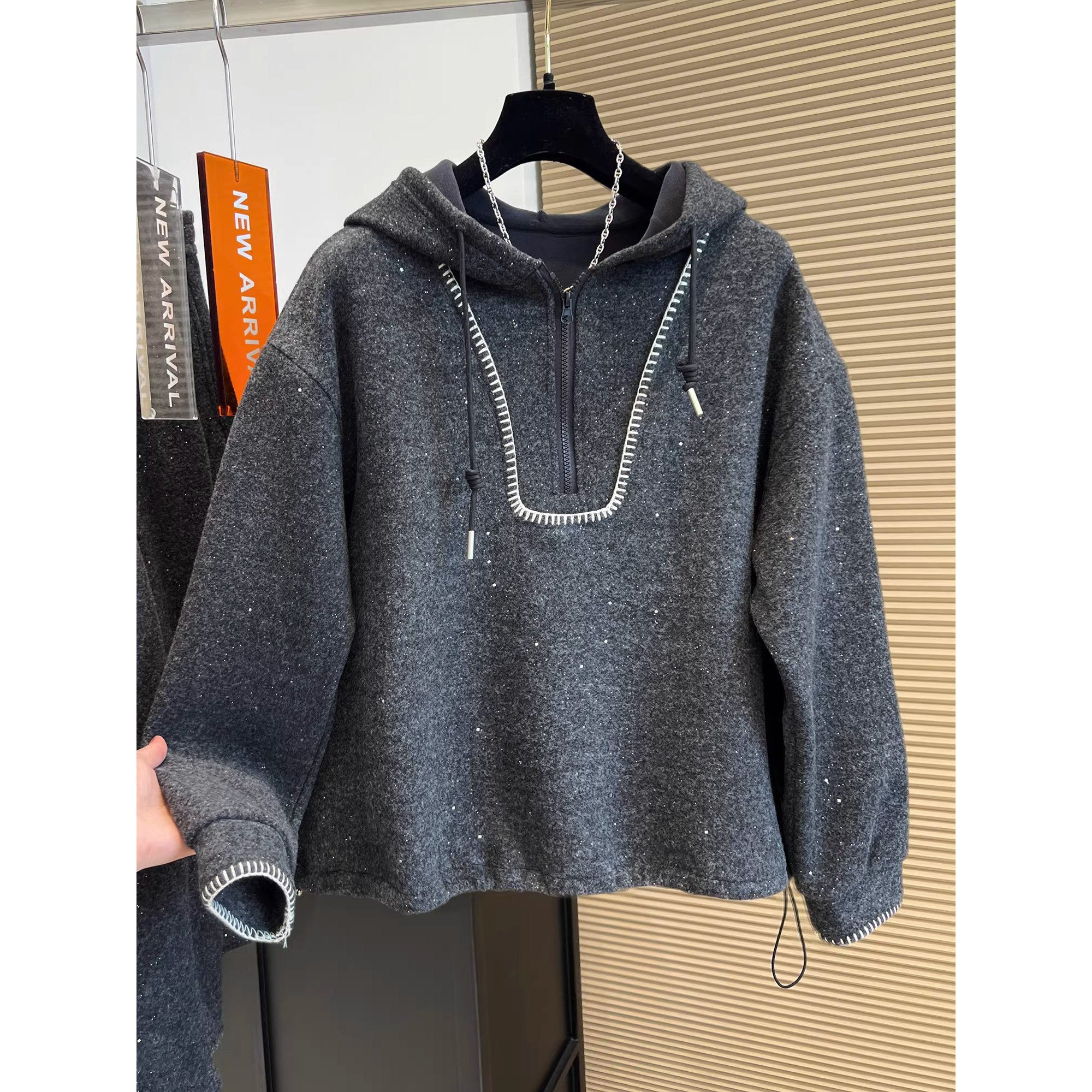 重工亮片拼接半拉链加绒卫衣女2025冬季新款撞色明线设计连帽上衣