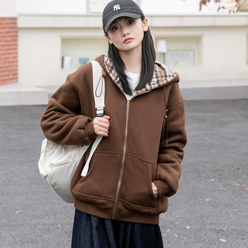 理想岛 格纹两面穿拉链加绒卫衣女25秋冬季新款宽松连帽上衣外套
