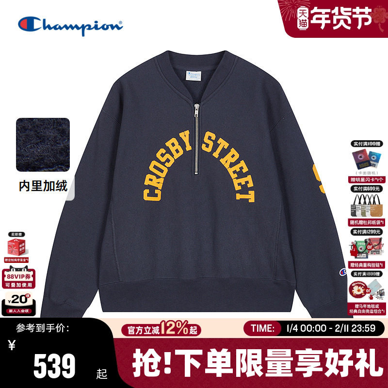 Champion冠军半拉链加绒卫衣女25冬季新款V领红色校园球衣风宽松