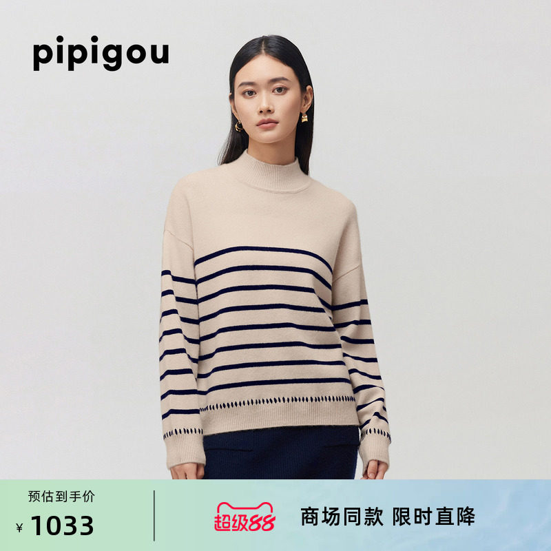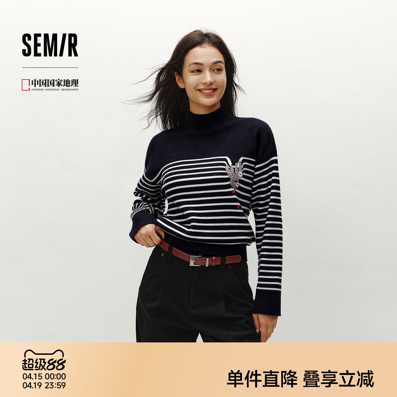 森柔|森马中国国家地理系列毛衣女冬季半高领刺绣条纹衫休闲毛衫