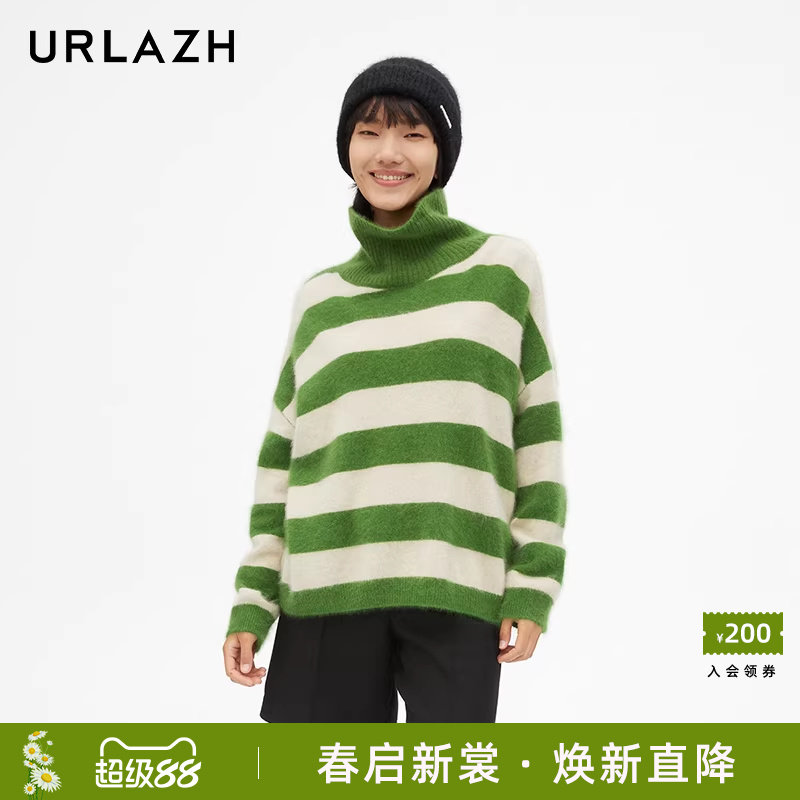URLAZH有兰新款复古慵懒撞色条纹高领休闲宽松套头长袖针织毛衣女