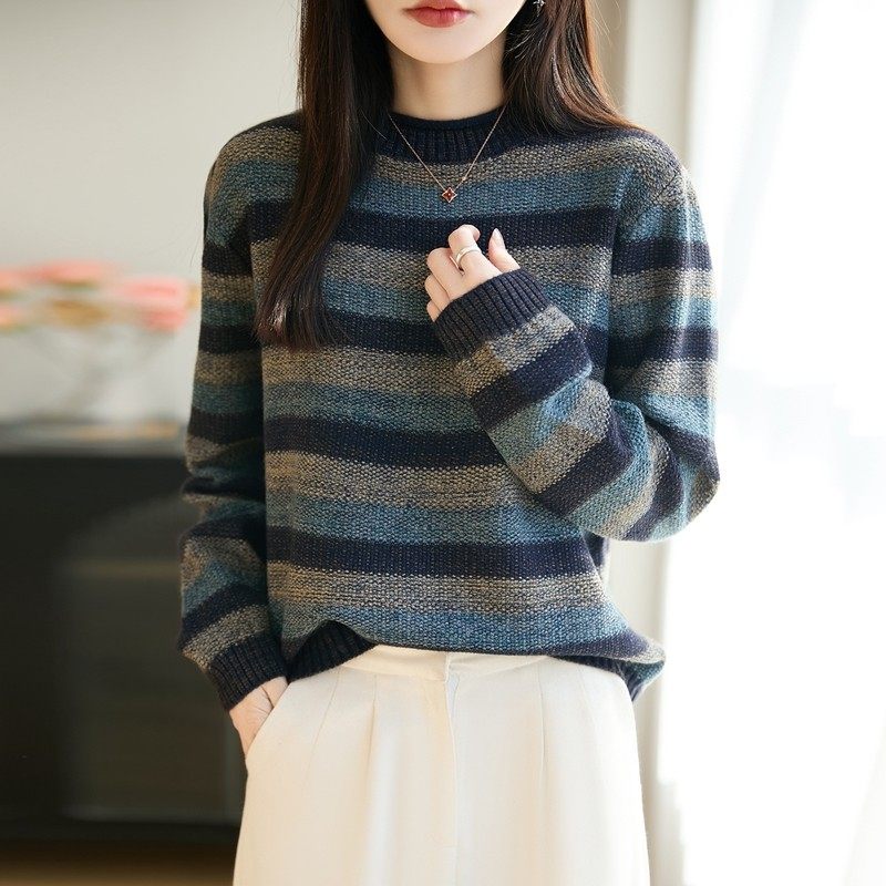 纯棉针织半高领毛衣女可外穿加厚保暖慵懒风复古条纹休闲打底上衣