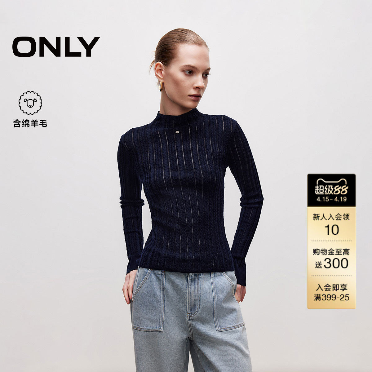 ONLY2026春季新款立体坑条纹高领正肩长袖含绵羊毛针织衫上衣女