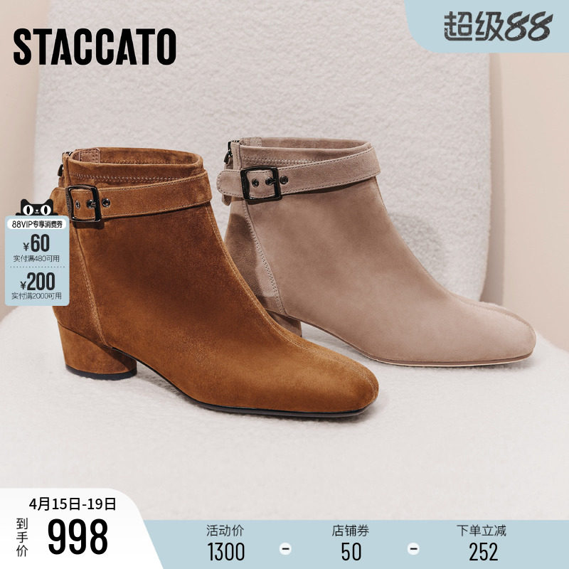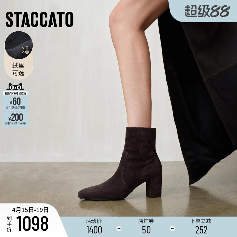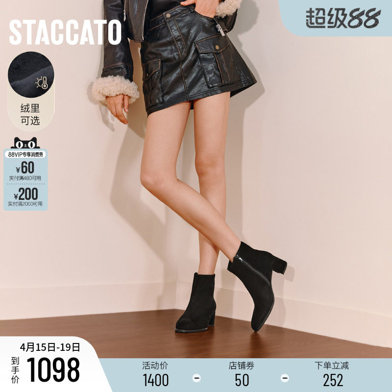 思加图新款锈色海棠短靴粗跟美拉德时装靴加绒女靴子EYJ03DD5
