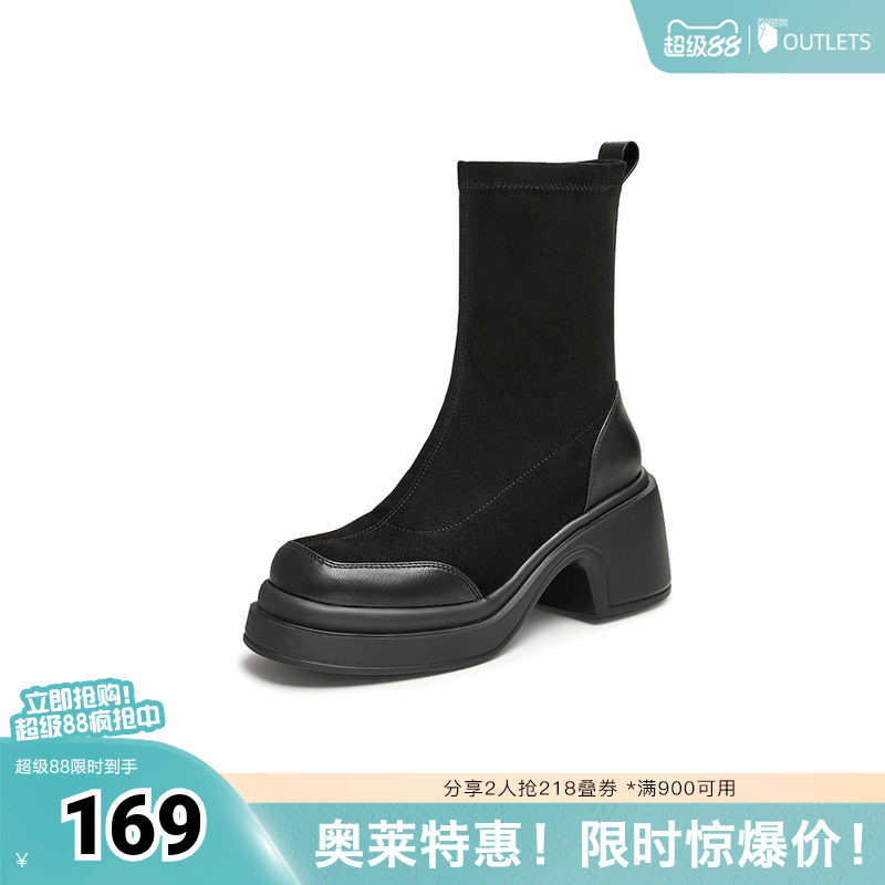 思加图新款气质通勤奶油靴时装靴黑色短靴粗跟增高女靴子9S006DD5