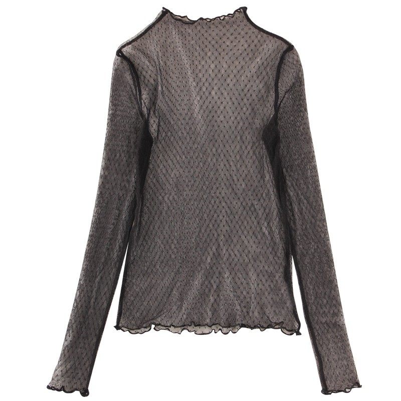 木耳边波点黑色网纱打底衫女长袖秋季半高领内搭蕾丝气质薄款上衣