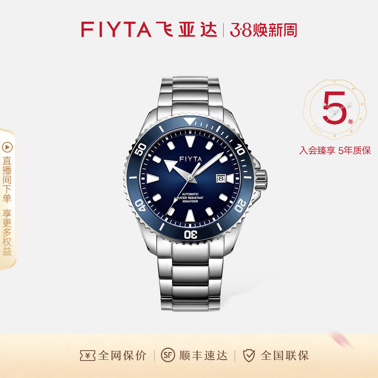 飞亚达远洋系列手表男夜光机械表潜水表钢带运动手表防水小众男表