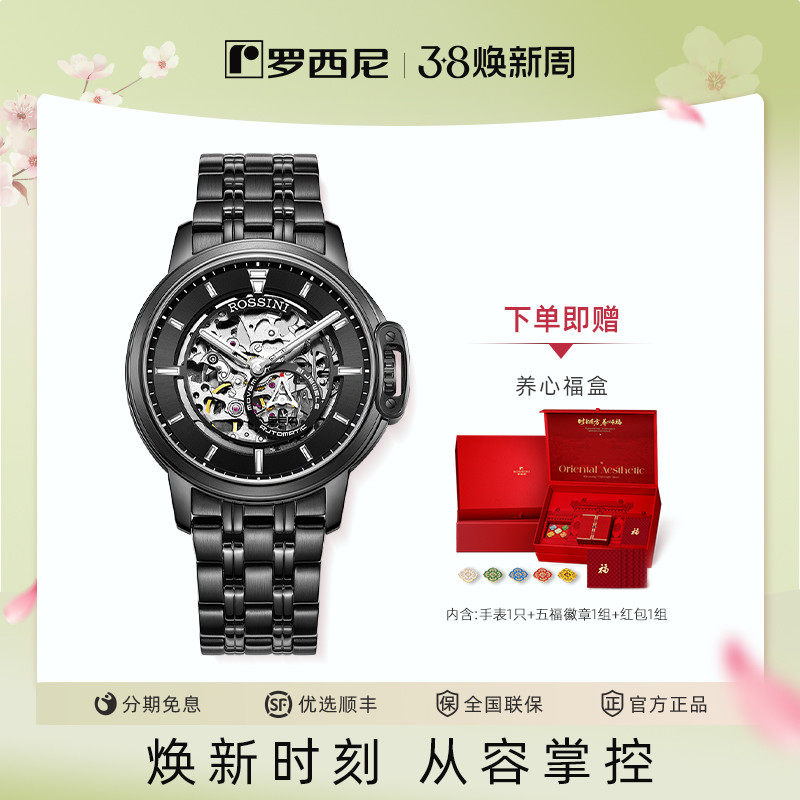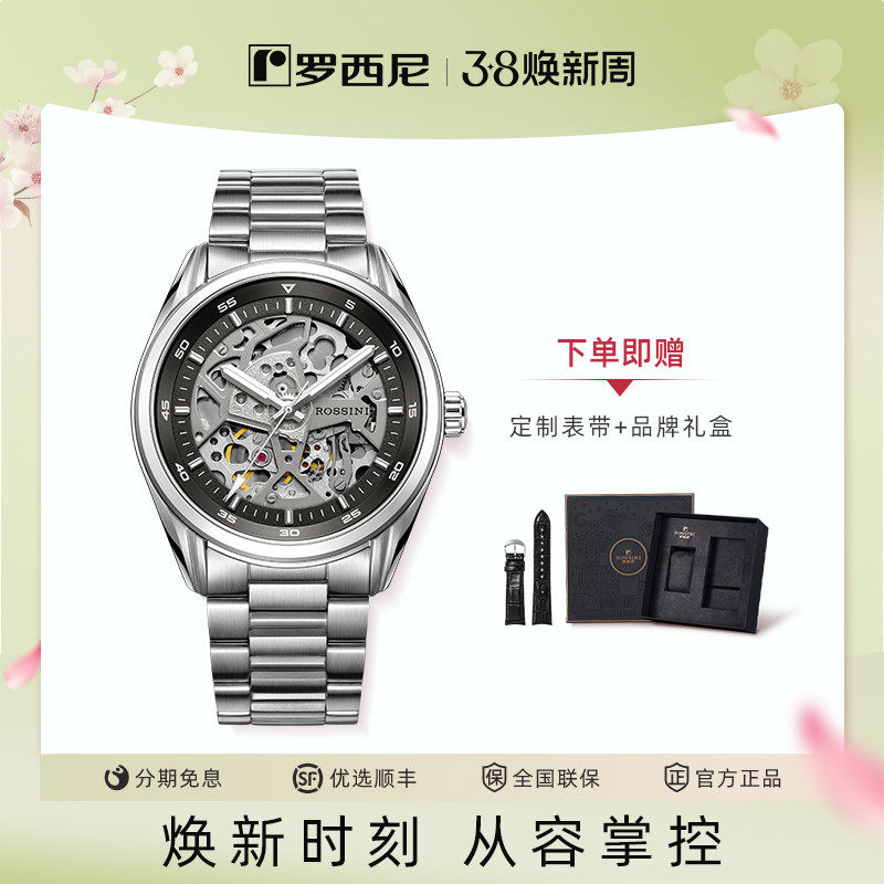 正品牌专柜机械表男表夜光镂空防水全自动手表罗西尼瑞士原装进口