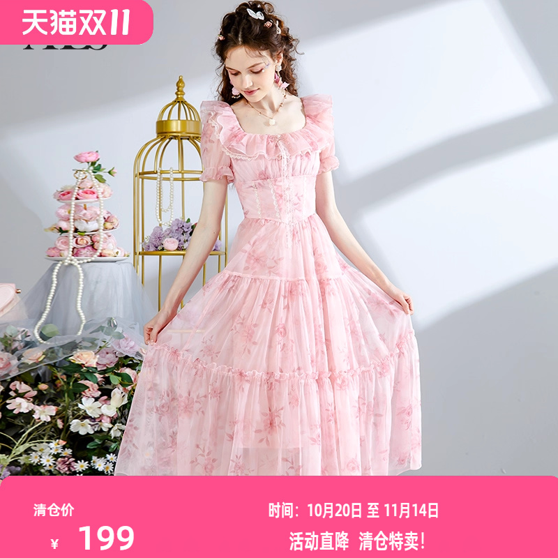 - 春装小清新长袖碎花雪纺连衣裙套装裙中长款宽松吊带网纱裙两件套
